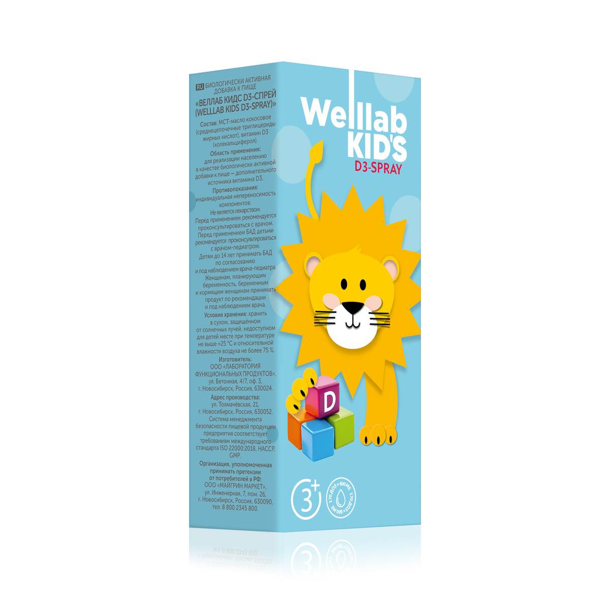 WELLLAB KIDS D3-СПРЕЙ — «солнечный» витамин для детей с 3 лет в виде удобного спрея. Продукт легко дозируется: при одном нажатии в организм поступает 600 МЕ витамина D3, при трех нажатиях — 1800 МЕ. Обновленная формула не содержит ароматизаторов. Без сахара, красителей и консервантов.